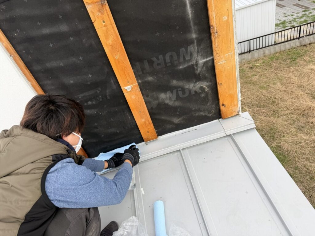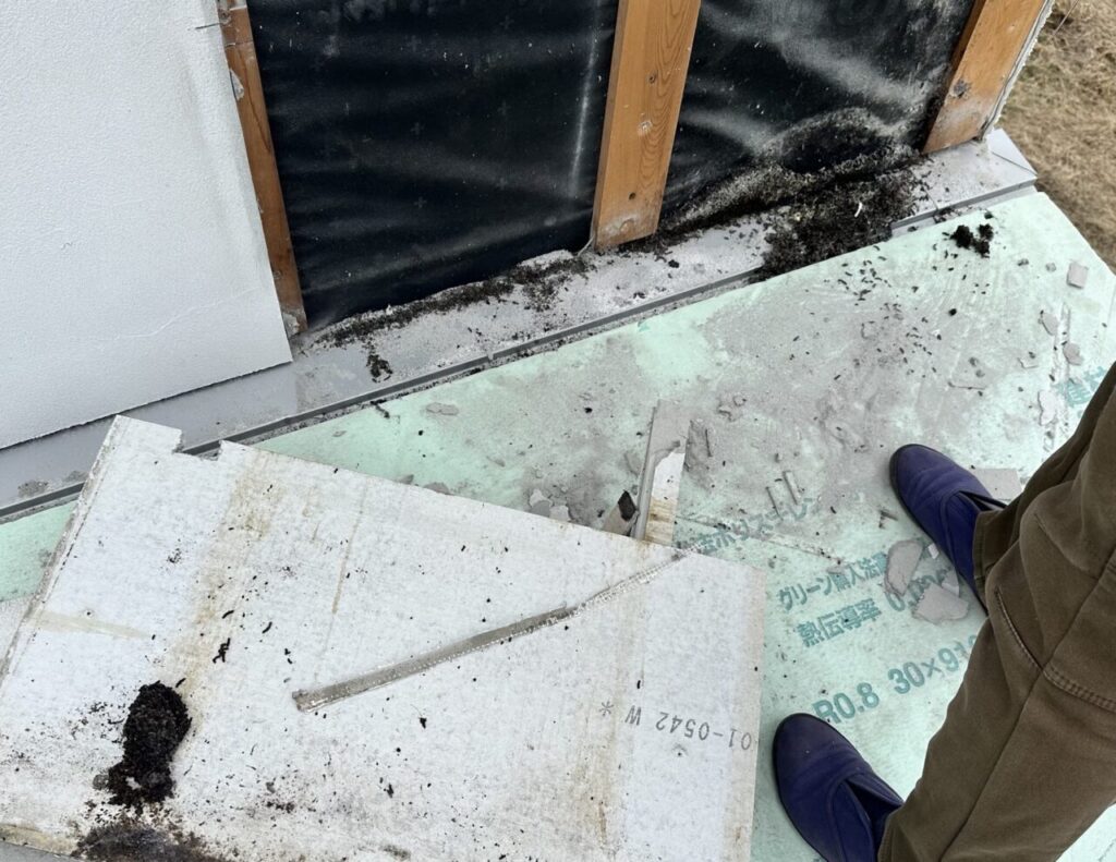 屋根バンキンの隙間からコウモリが侵入し、外壁内で営巣していた。外壁を開口し糞掃除消毒作業を行った。